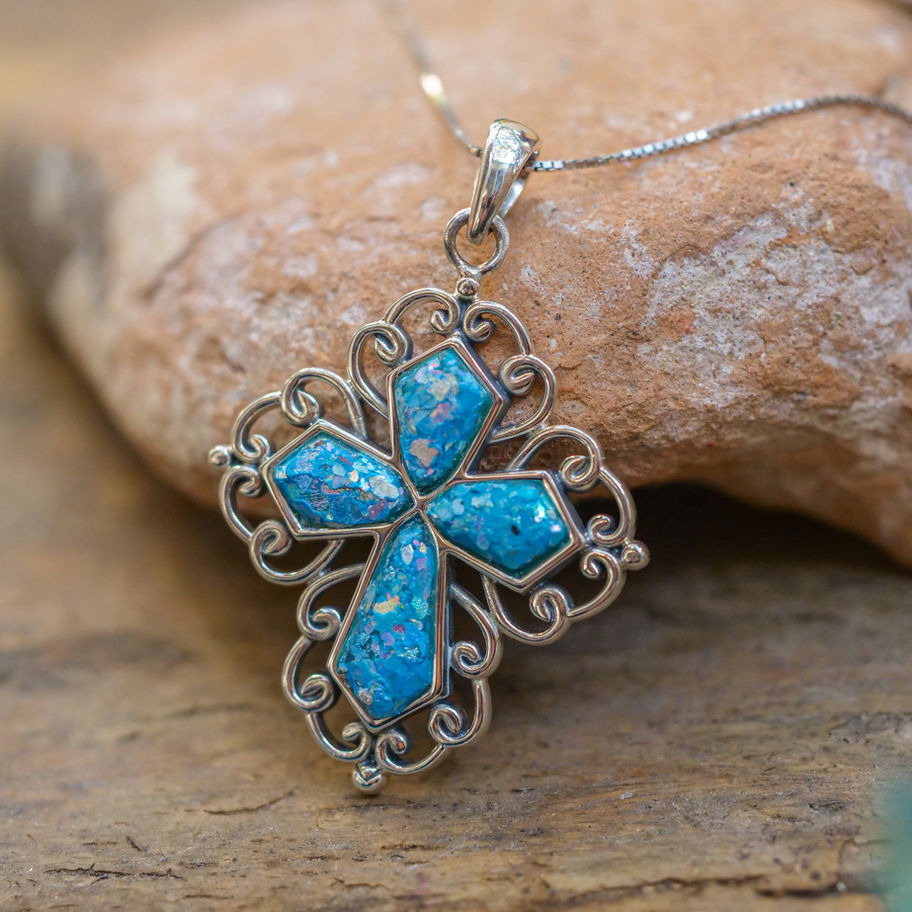 The floral-inspired silhouette softens the strength of the cross with flowing, ornamental detail. At its center and arms, fragments of ancient Roman Glass shimmer in oceanic tones of blue and turquoise — each piece uniquely weathered by time.