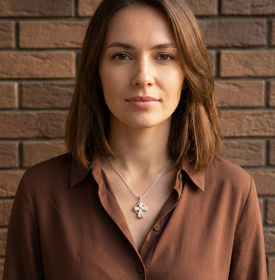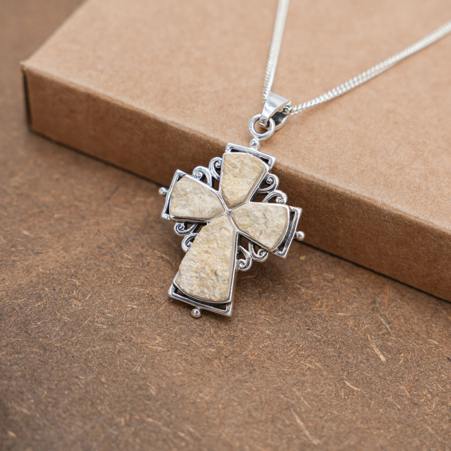 A sophisticated interpretation of the classic Latin Cross, this pendant features four precisely cut segments of Jerusalem stone forming a structured inlay. Subtle filigree detailing beneath the stone panels adds depth and refinement, creating a balanced and dimensional silhouette.