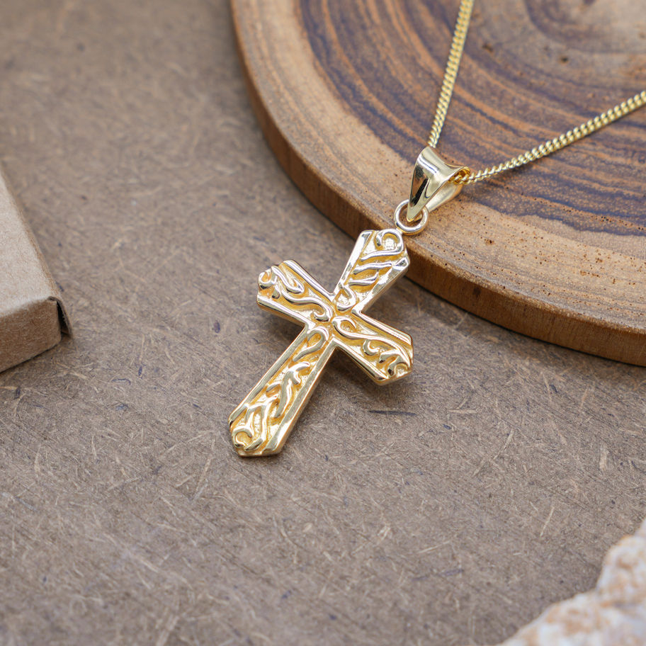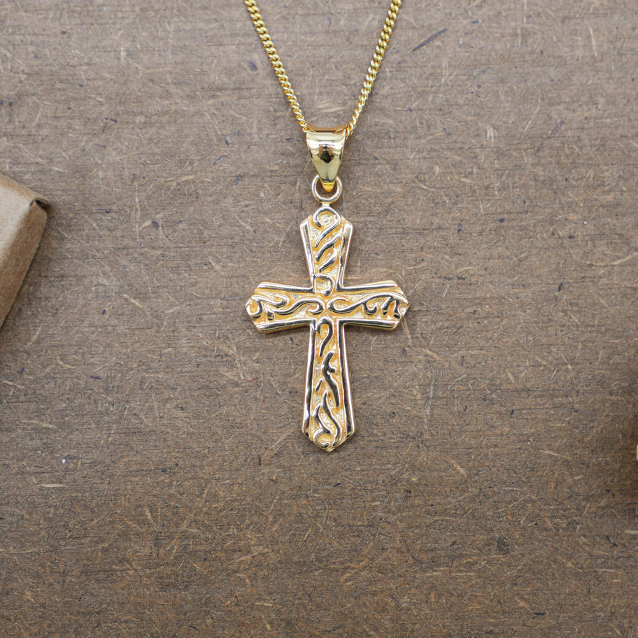 The engraved patterns create texture and depth, giving the piece an artistic and refined character while maintaining a timeless cross silhouette. The interplay between polished gold and precise carving allows light to move gently across the design, emphasizing craftsmanship and detail without the need for stones.