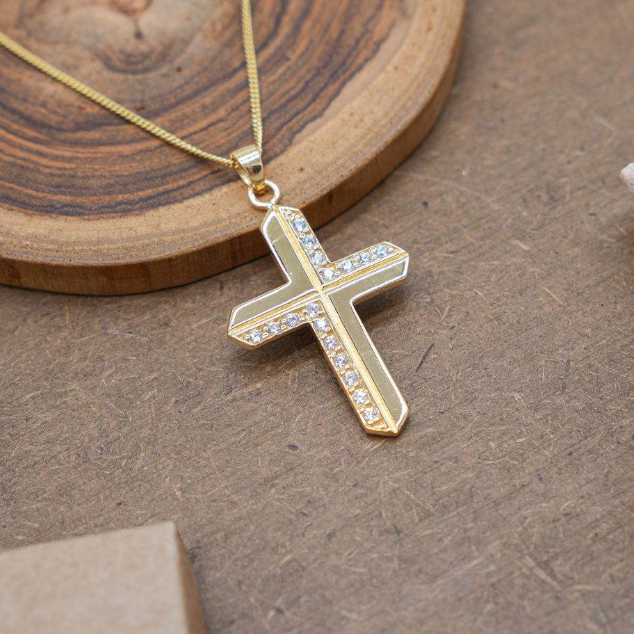 Designed as a striking expression of faith, the cross is accented with brilliant Cubic Zirconia stones that catch the light with every movement. Its strong proportions and clean geometry create a powerful presence, while the subtle sparkle adds refinement and elegance.