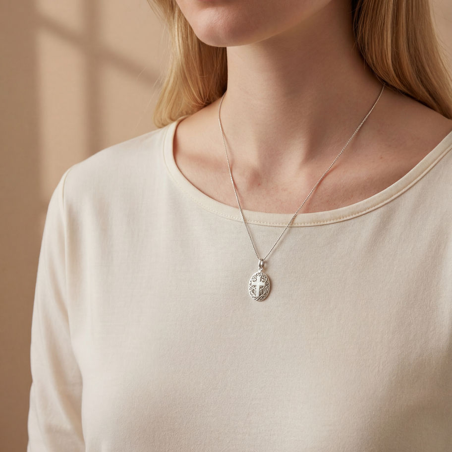 A refined oval locket crafted in 925 Sterling Silver, featuring an intricate openwork cross on the front.