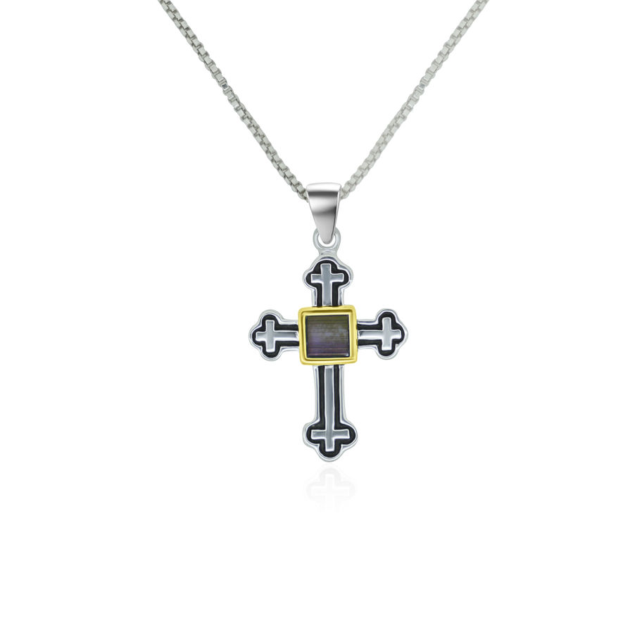 A structured cross crafted in 925 sterling silver, finished with detailed black oxidization along the edges and contours.