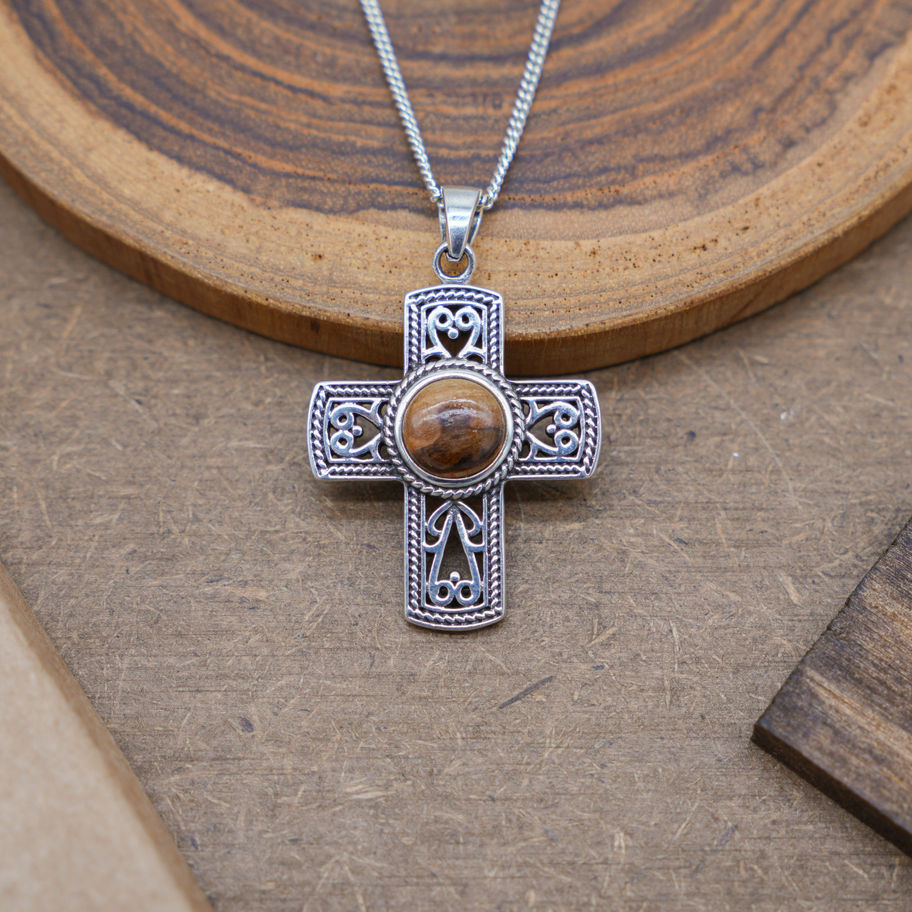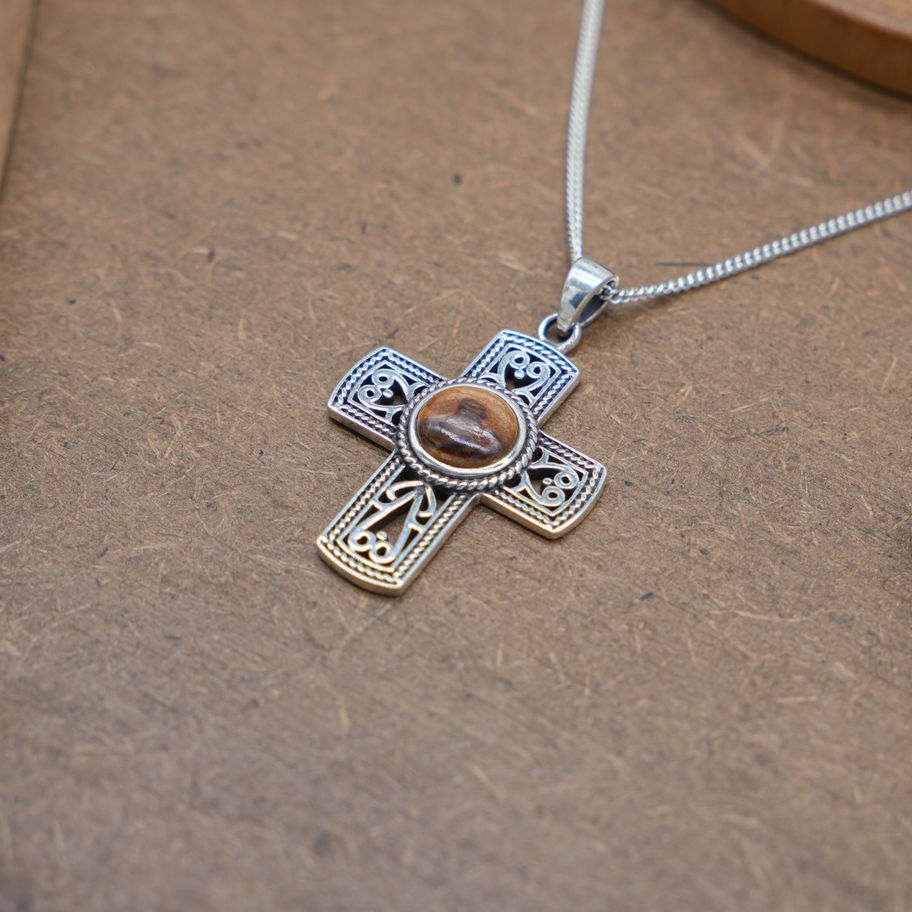 A graceful cross pendant crafted in solid 925 Sterling Silver, featuring filigree-style heart motifs and centered with authentic olive wood from the Holy Land.