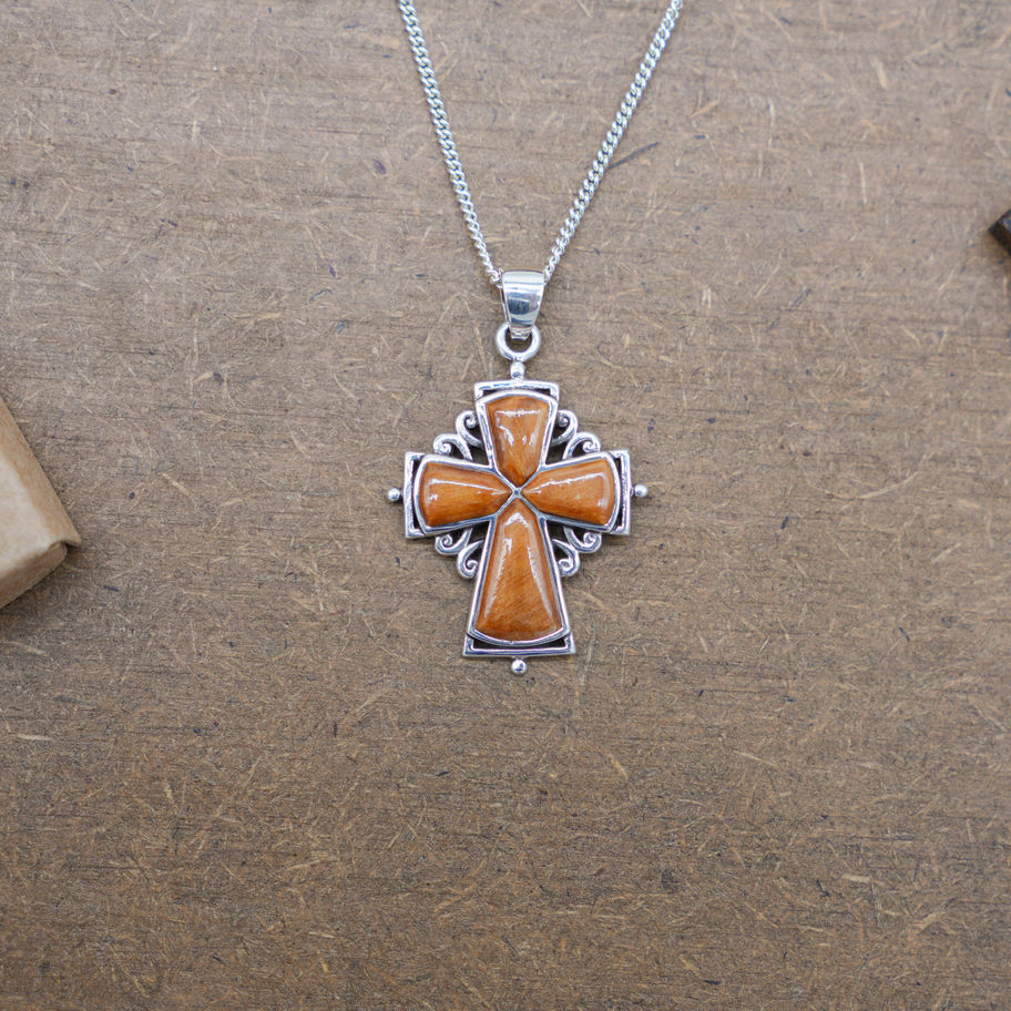 An elegant cross pendant crafted in solid 925 Sterling Silver and inlaid with authentic olive wood from the Holy Land.