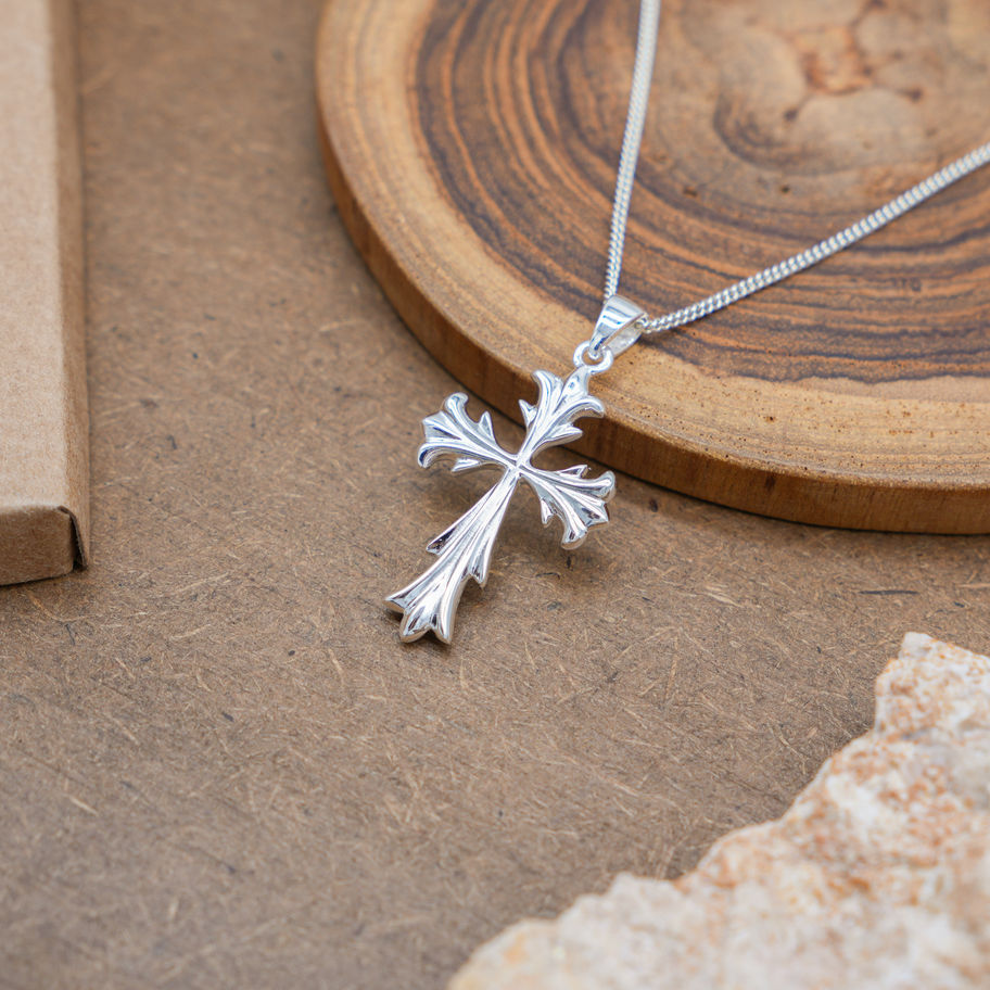 Soft contours and gently expanding lines give the cross a living, sculptural presence, moving away from rigid geometry toward a more natural expression of faith. Its balanced proportions and understated design make it a timeless piece suited for everyday wear.