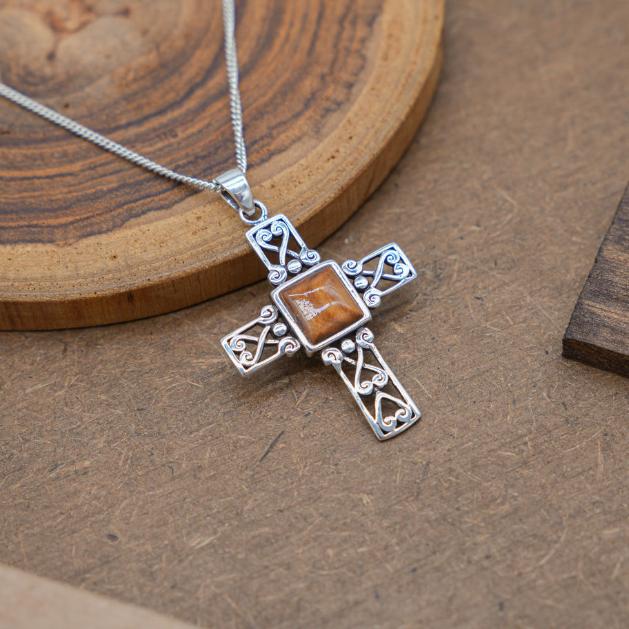 A beautifully detailed cross pendant crafted in solid 925 Sterling Silver and centered with authentic olive wood from Jerusalem.